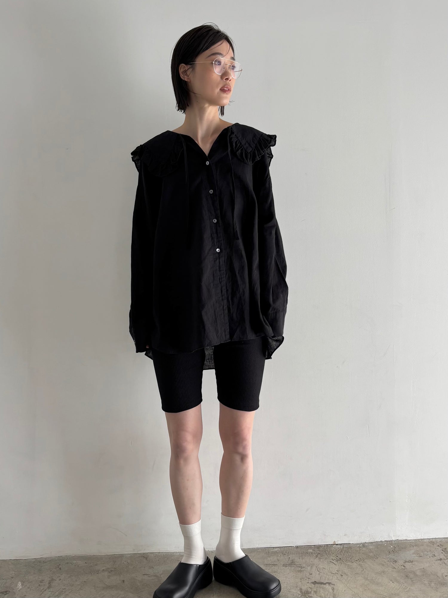 柔らかなコットンリネンを使用し、フリルカラーがポイントのブラウス。襟のフリルが甘くなりすぎず、大人な印象に。着丈は長めでヒップが隠れるデザインにし、どんなアイテムともスタイリングできます。