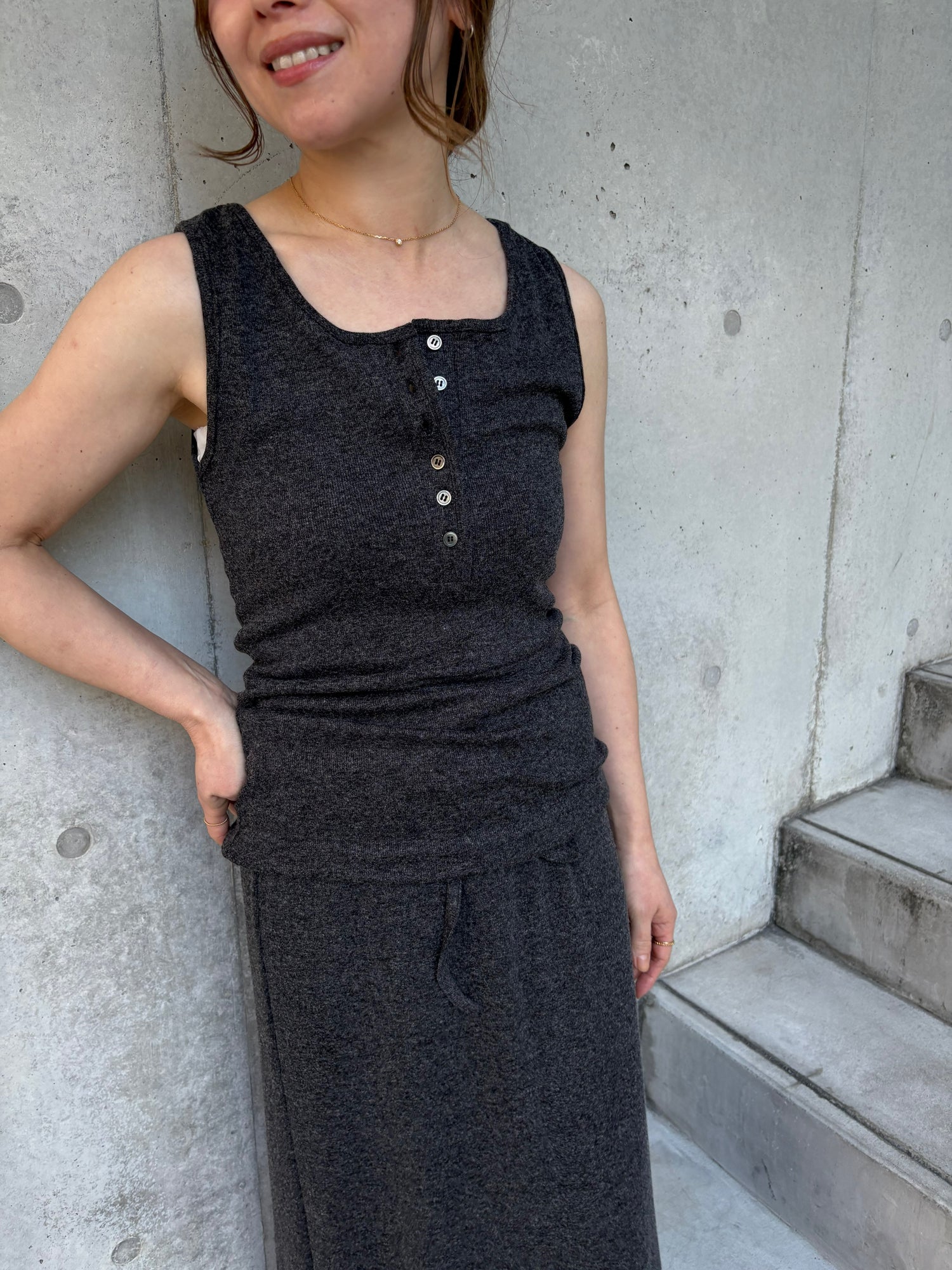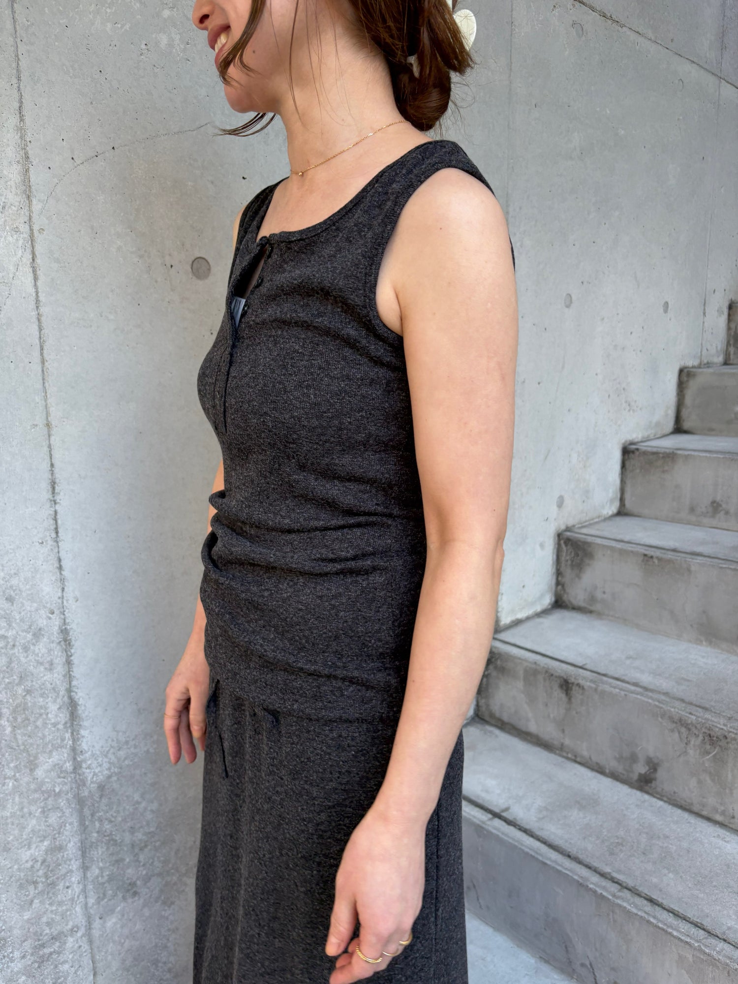 すっきりとしたIラインシルエットに、さりげないアクセントを効かせたフロントオープンデザインのタンクトップ。裾からスリットのように見せたり、インナーをちらりと覗かせたりと、着こなしの幅を広げてくれます。