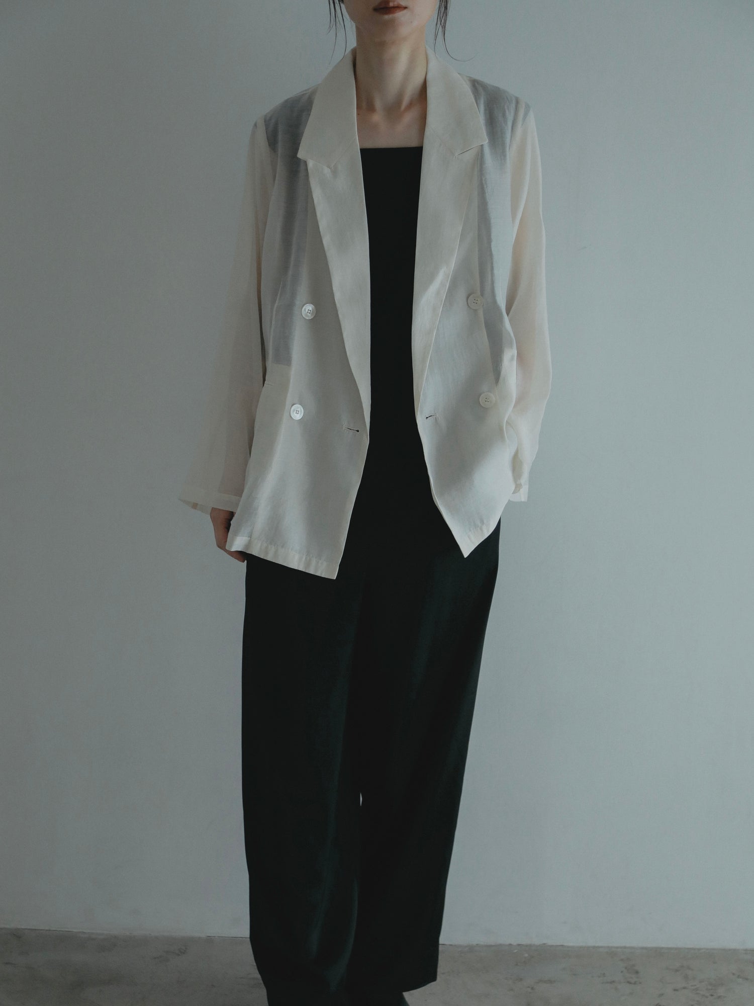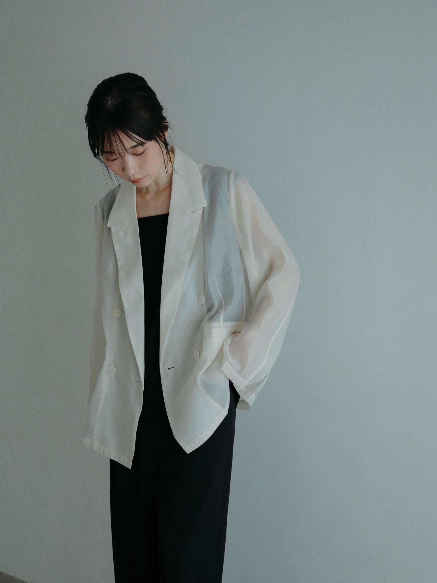 透け感が軽やかな印象のシアージャケット。張りのあるシアー素材を使い、程よい透け感と立体感がスタイルアップしてくれます。いつもジャケットを着ない方にもさらっと気軽にカーディガン感覚で羽織ってもらえるジャケットに仕上げました。オケージョン、オフィスカジュアルからデイリーまで活躍する万能アイテムです。