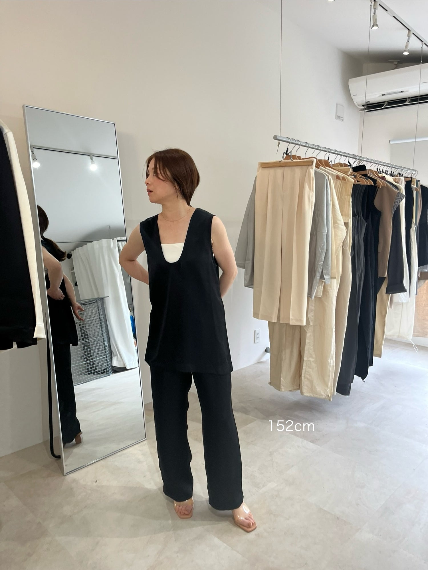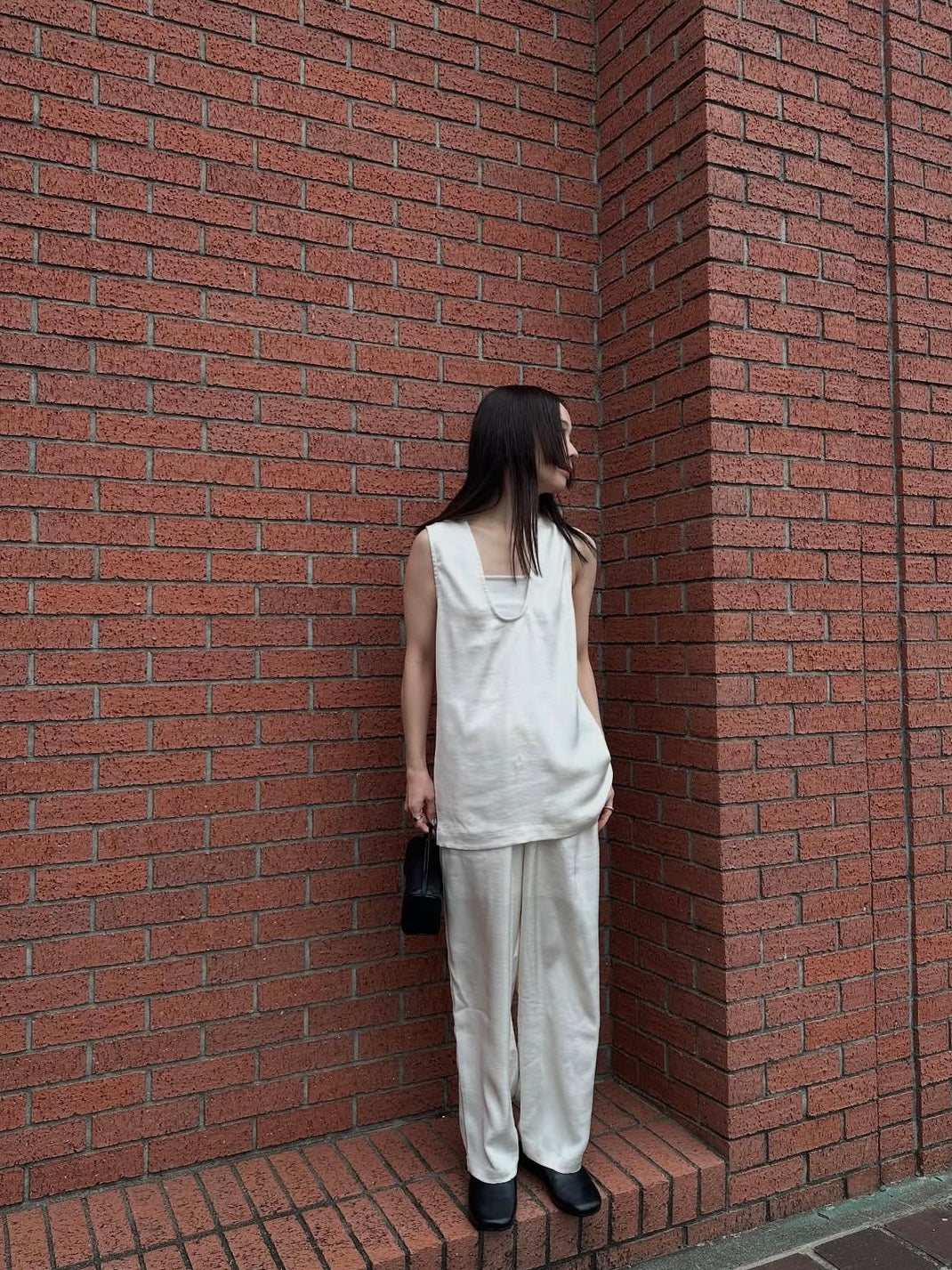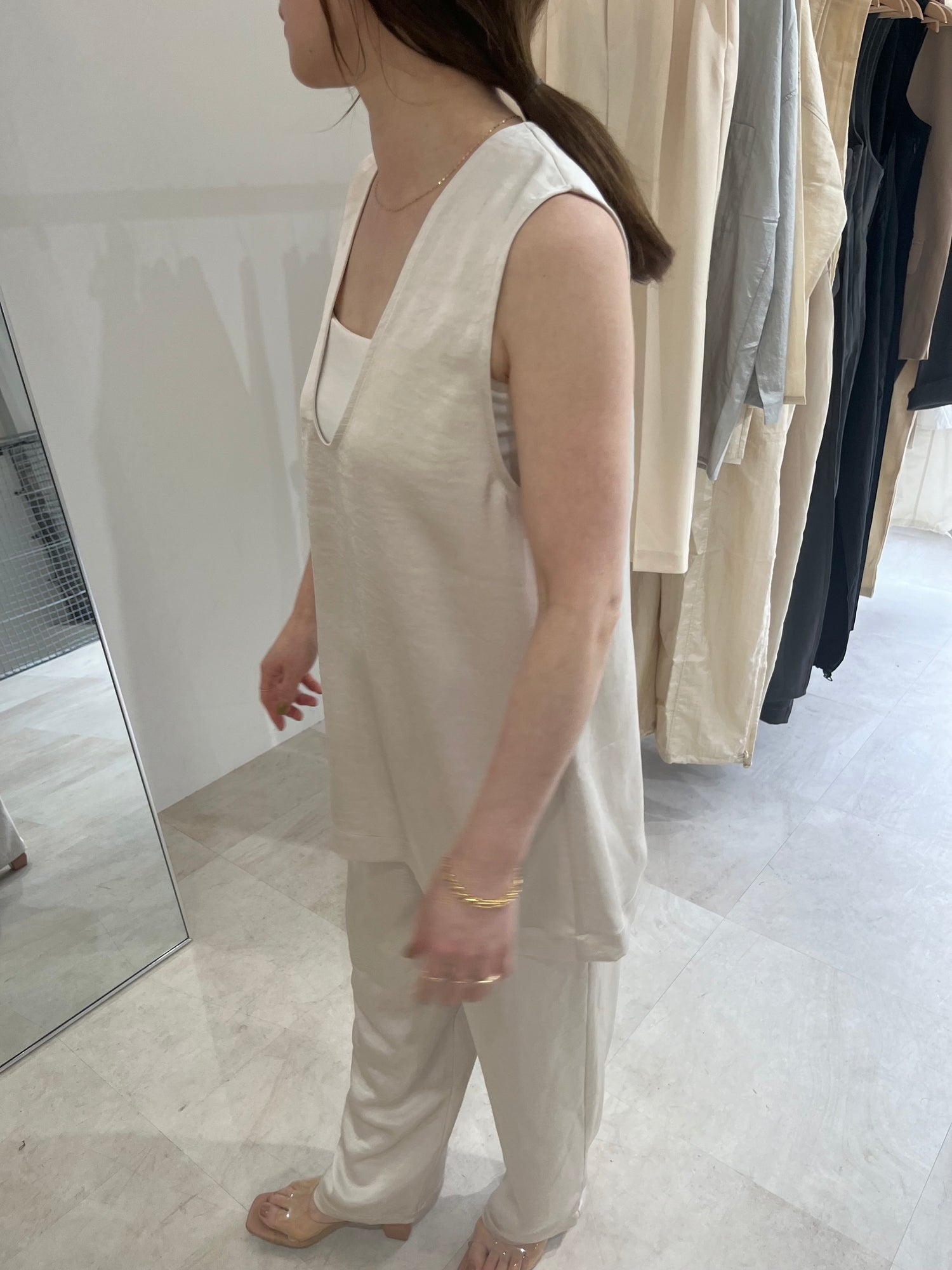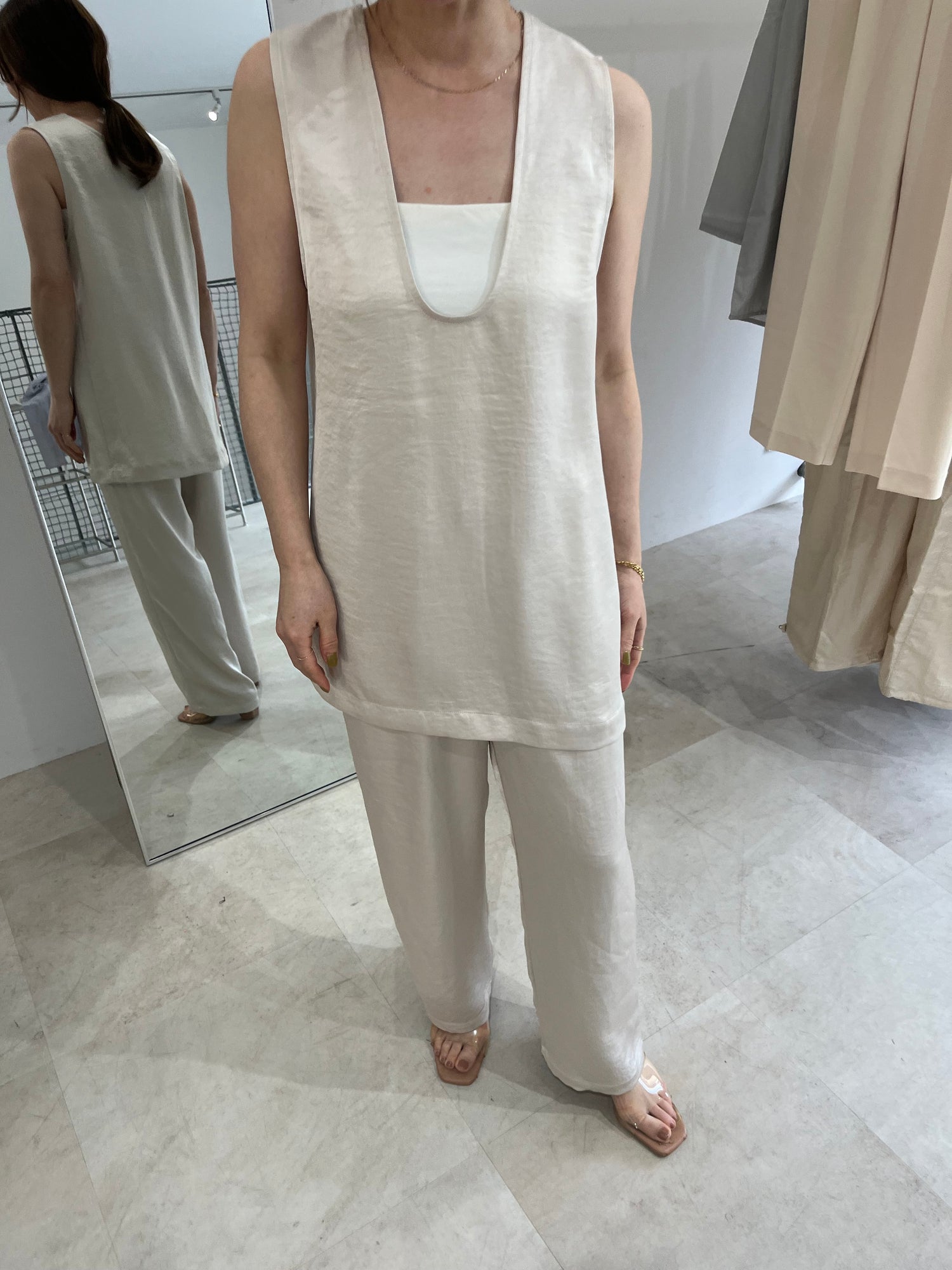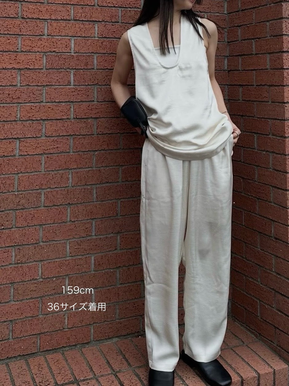 Uネックのシルエットがおしゃれなマットサテンのセットアップ。ウエストゴムのパンツとトップスがセットに。単品使いも着回し出来るので色違いで欲しくなるアイテム。