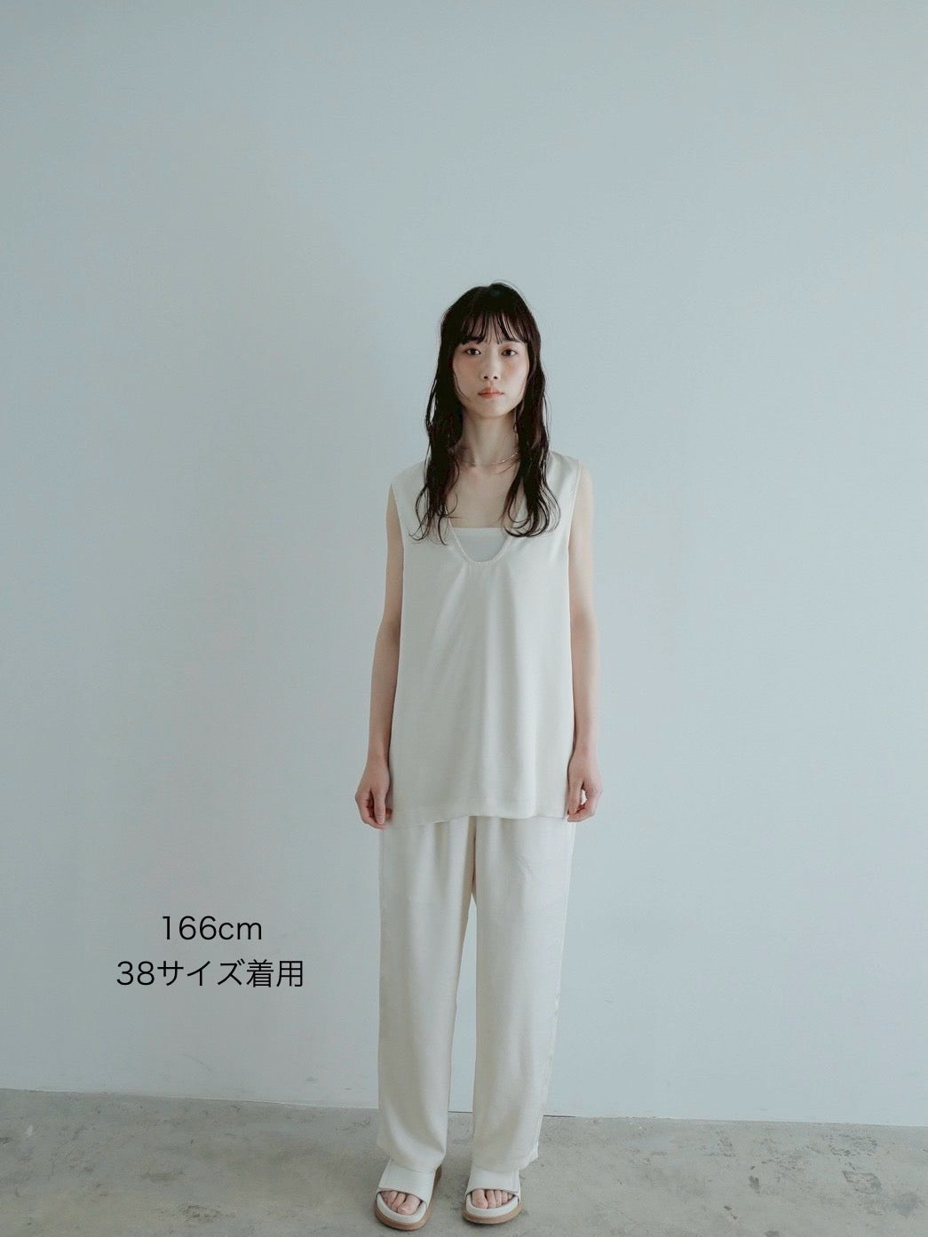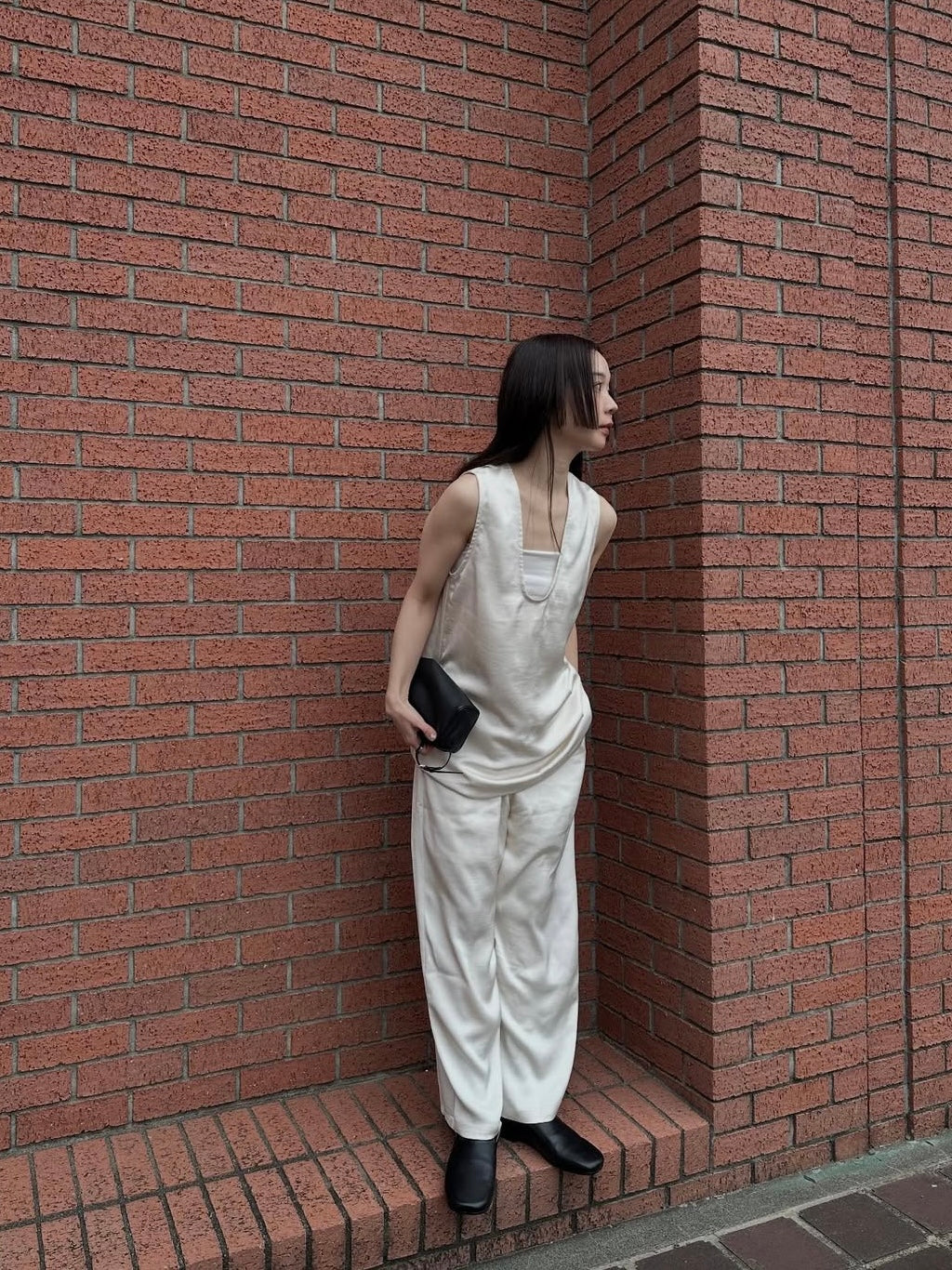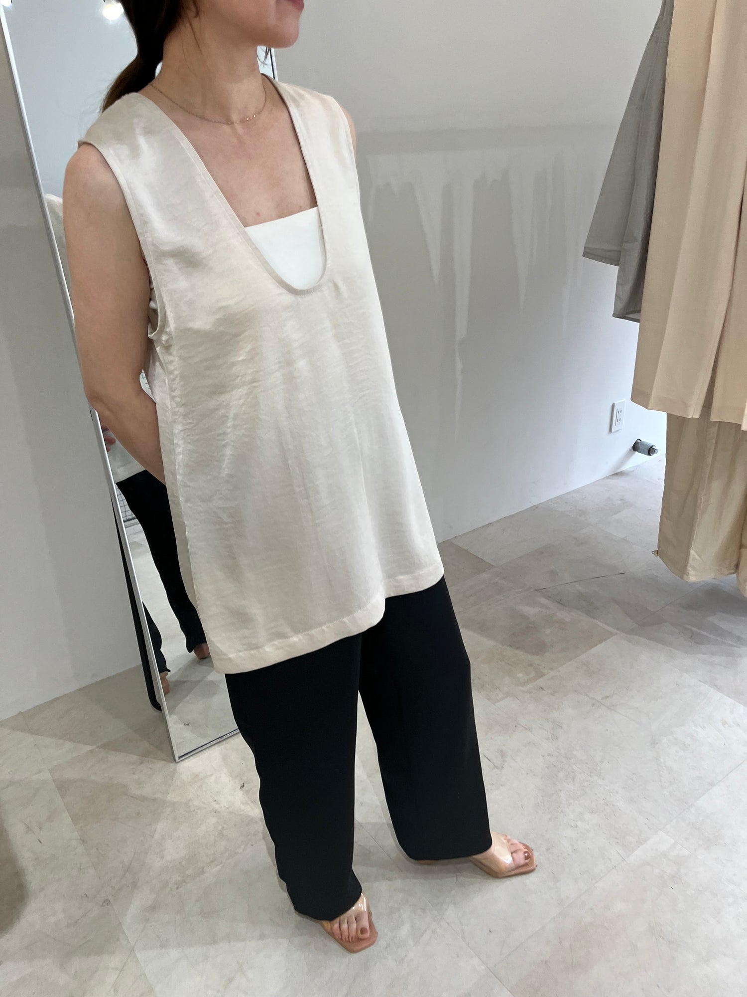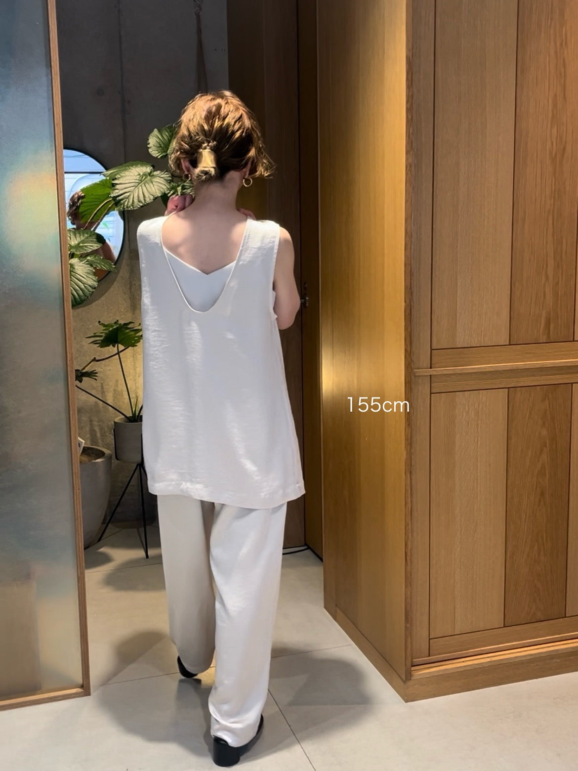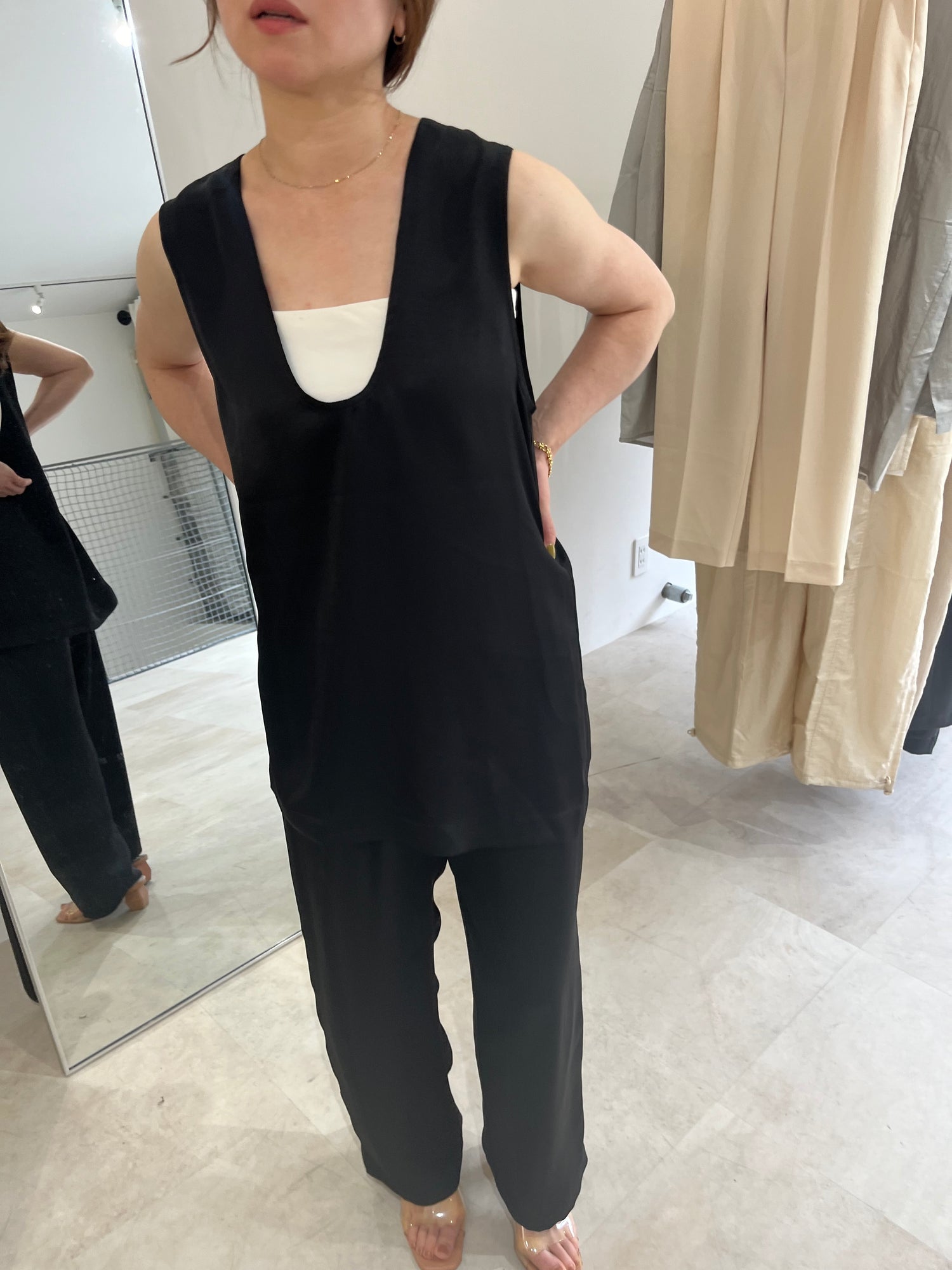 Uネックのシルエットがおしゃれなマットサテンのセットアップ。ウエストゴムのパンツとトップスがセットに。単品使いも着回し出来るので色違いで欲しくなるアイテム。
