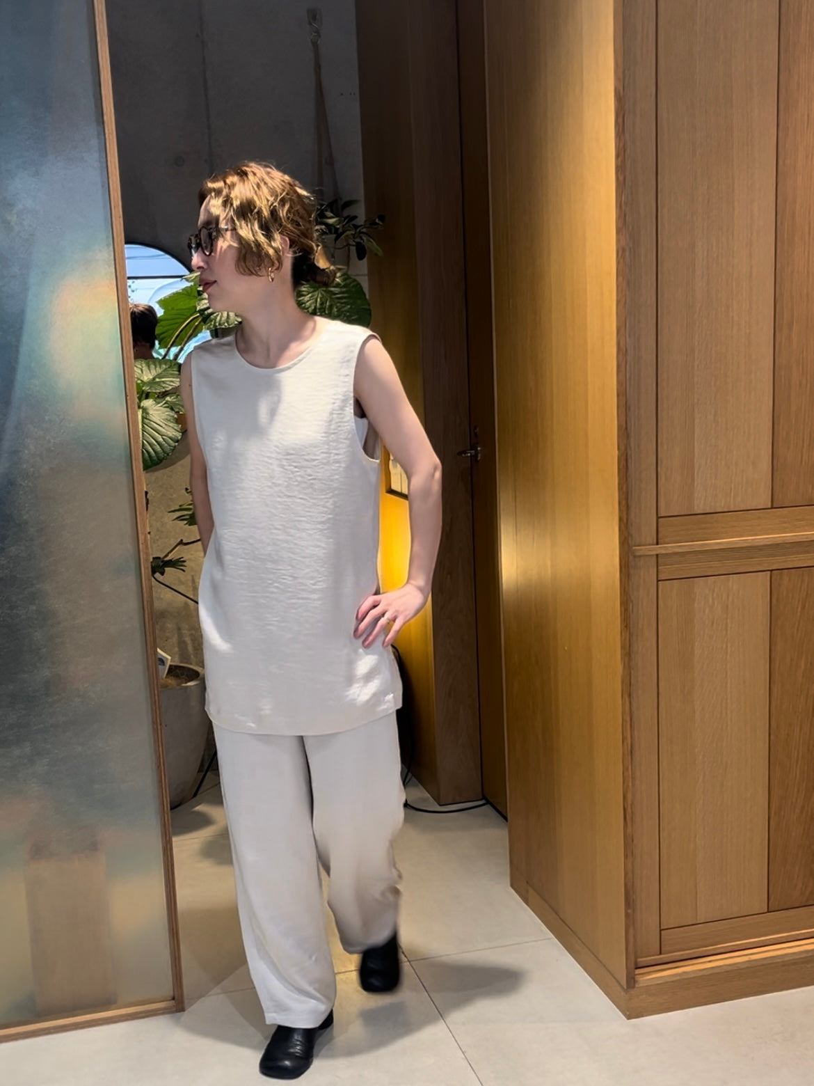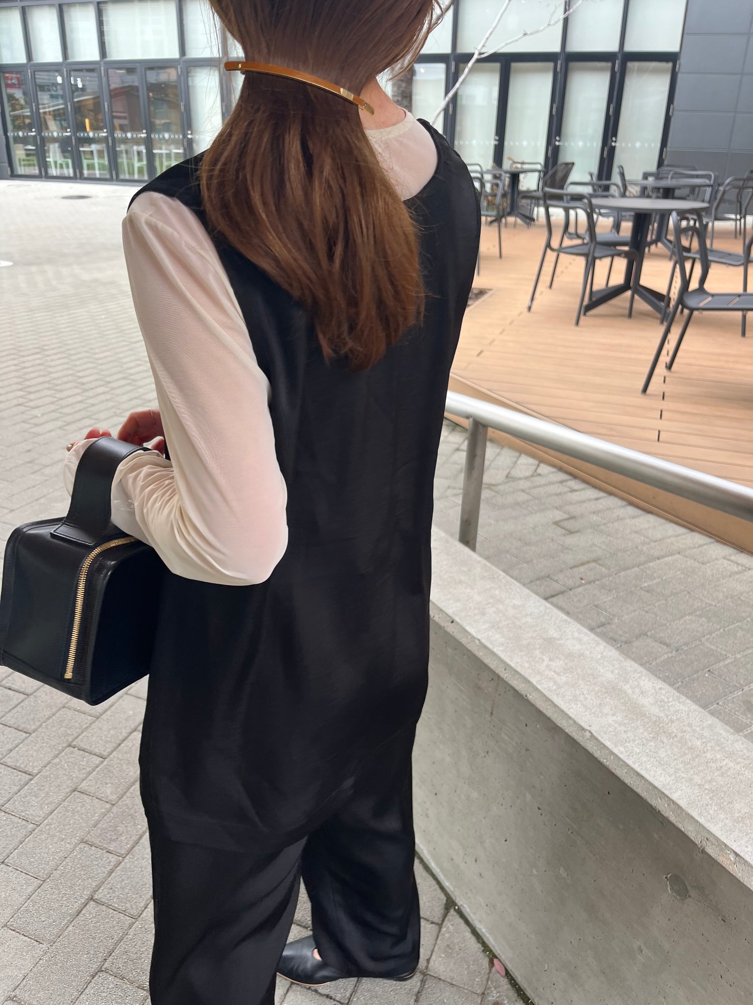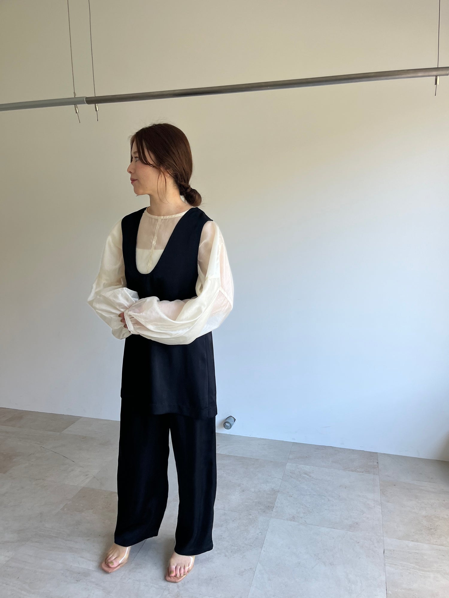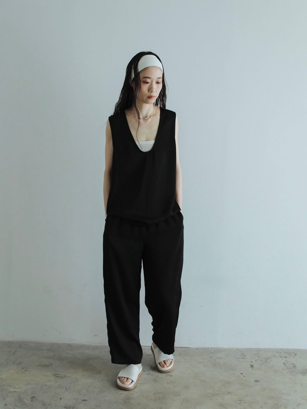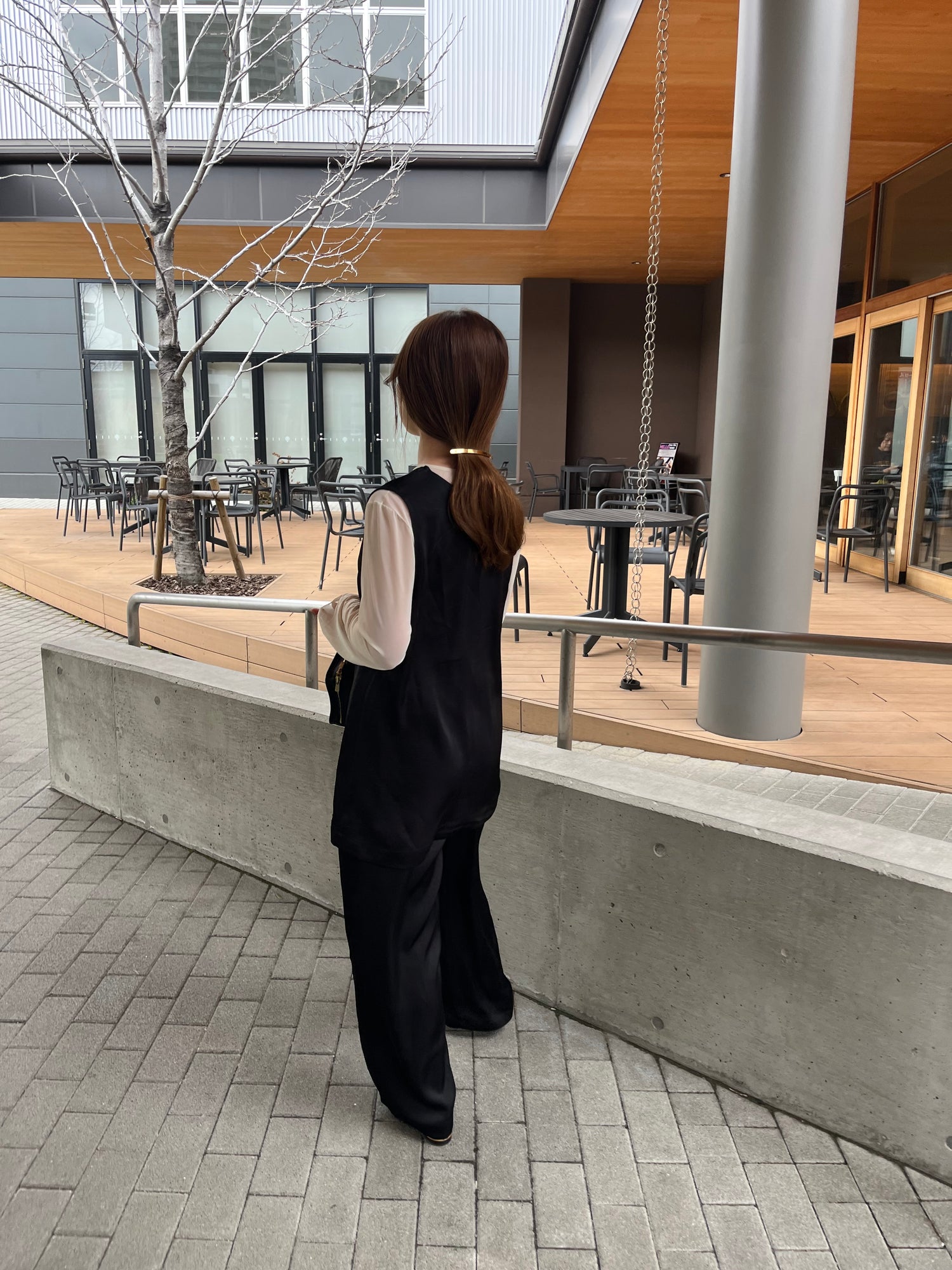Uネックのシルエットがおしゃれなマットサテンのセットアップ。ウエストゴムのパンツとトップスがセットに。単品使いも着回し出来るので色違いで欲しくなるアイテム。