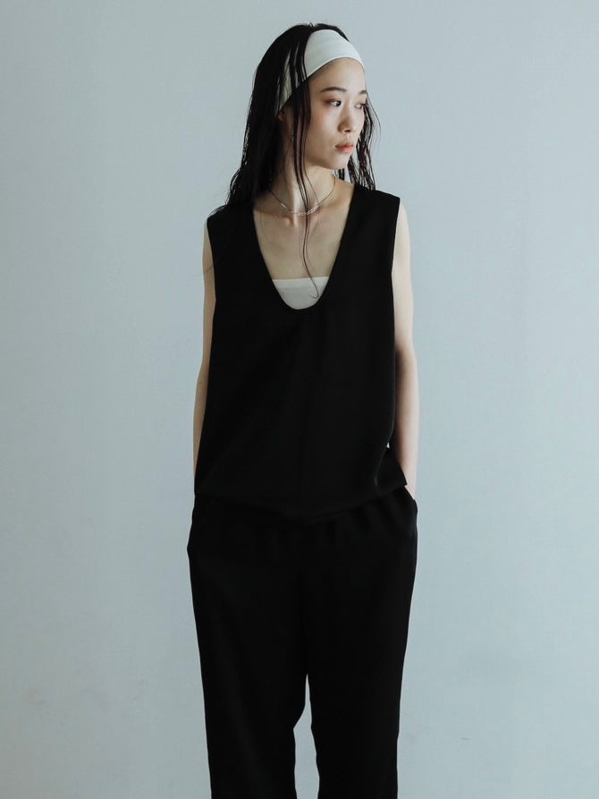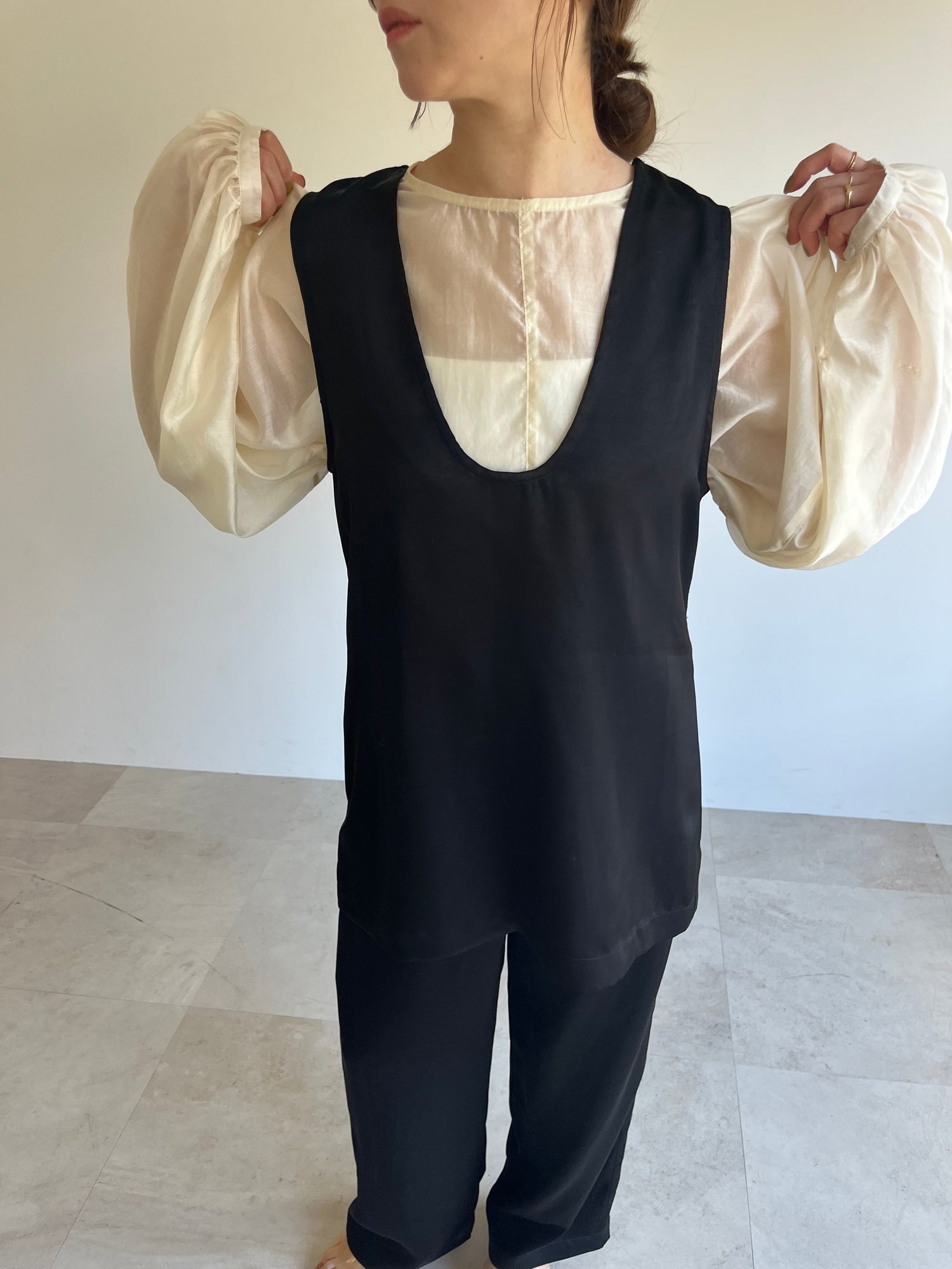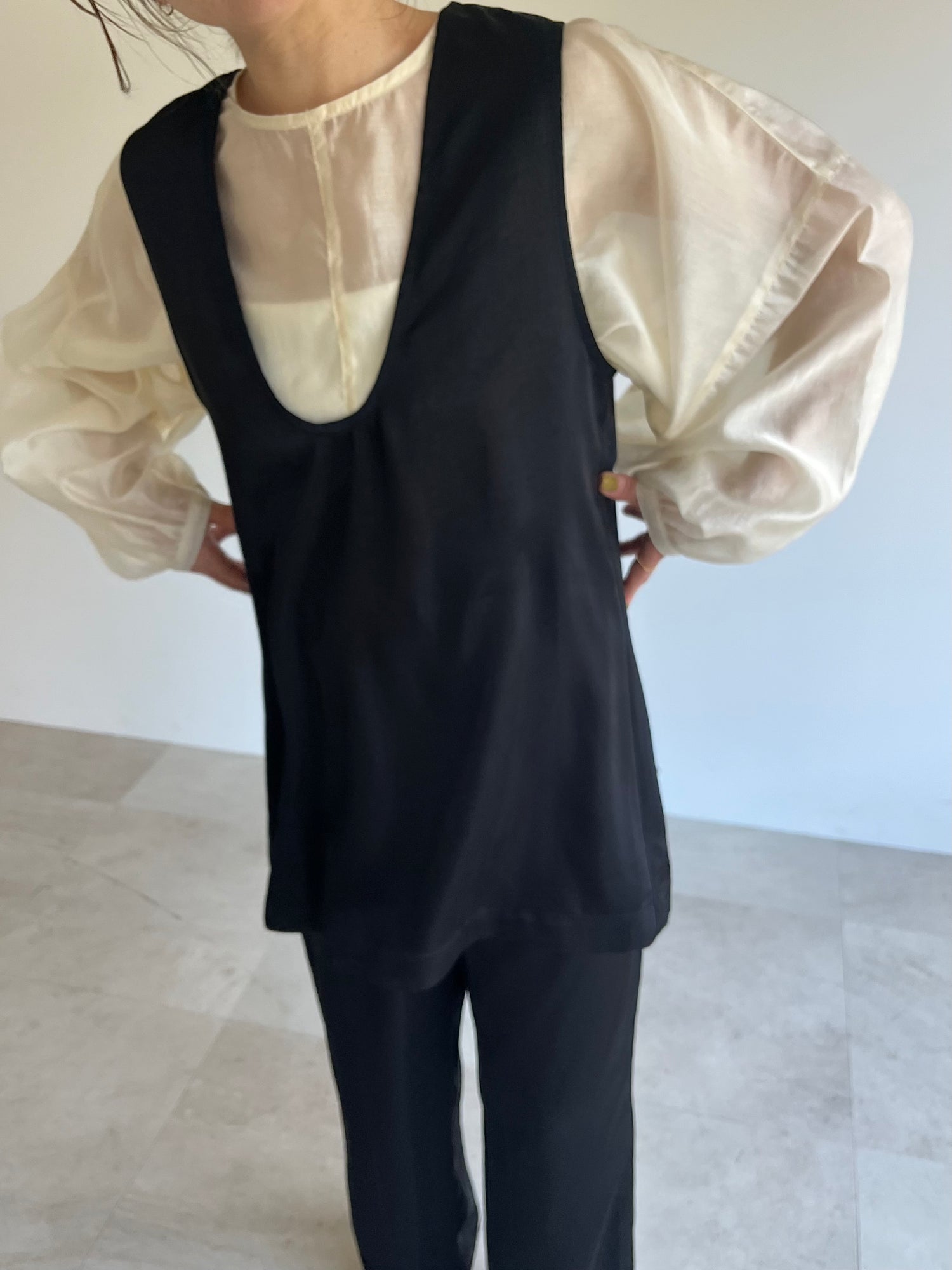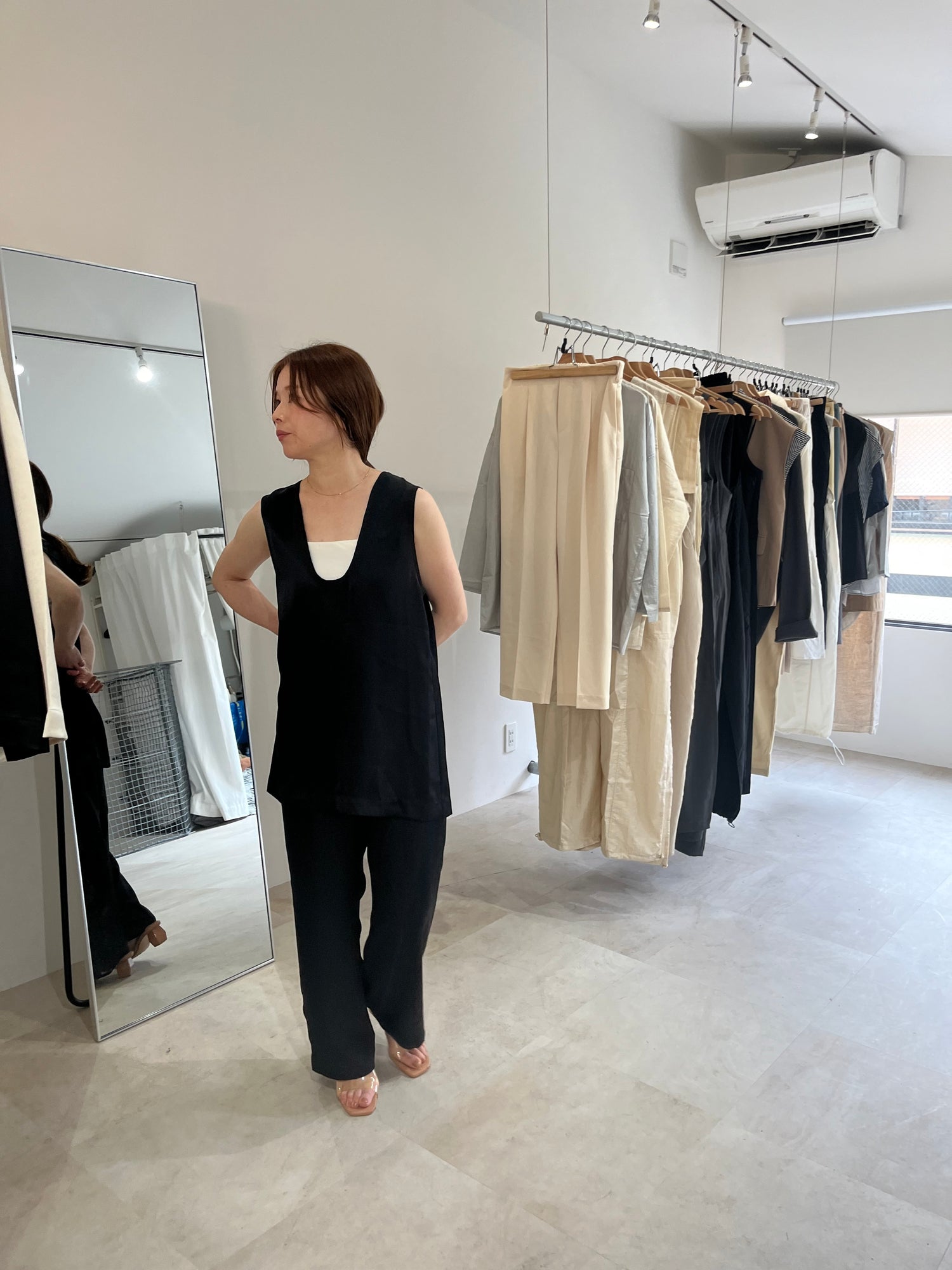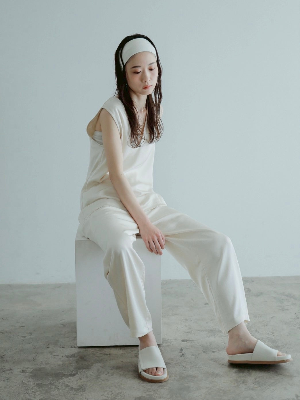 Uネックのシルエットがおしゃれなマットサテンのセットアップ。ウエストゴムのパンツとトップスがセットに。単品使いも着回し出来るので色違いで欲しくなるアイテム。