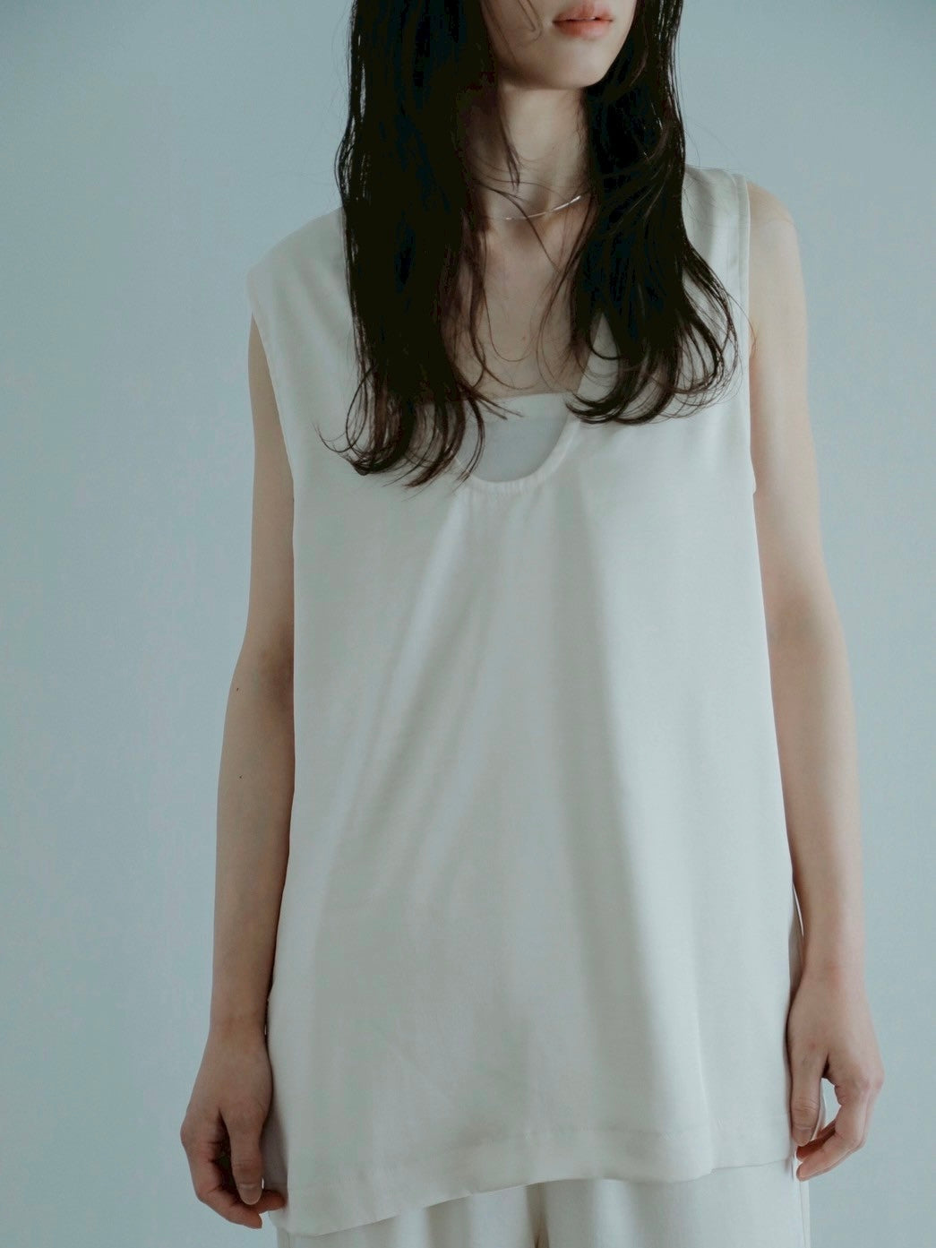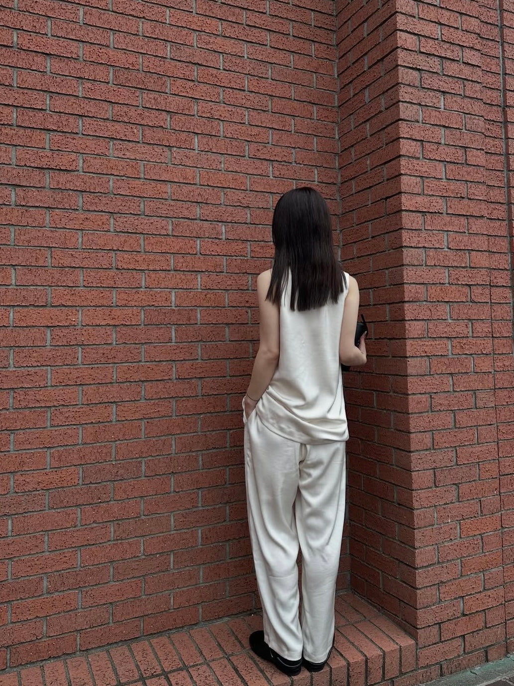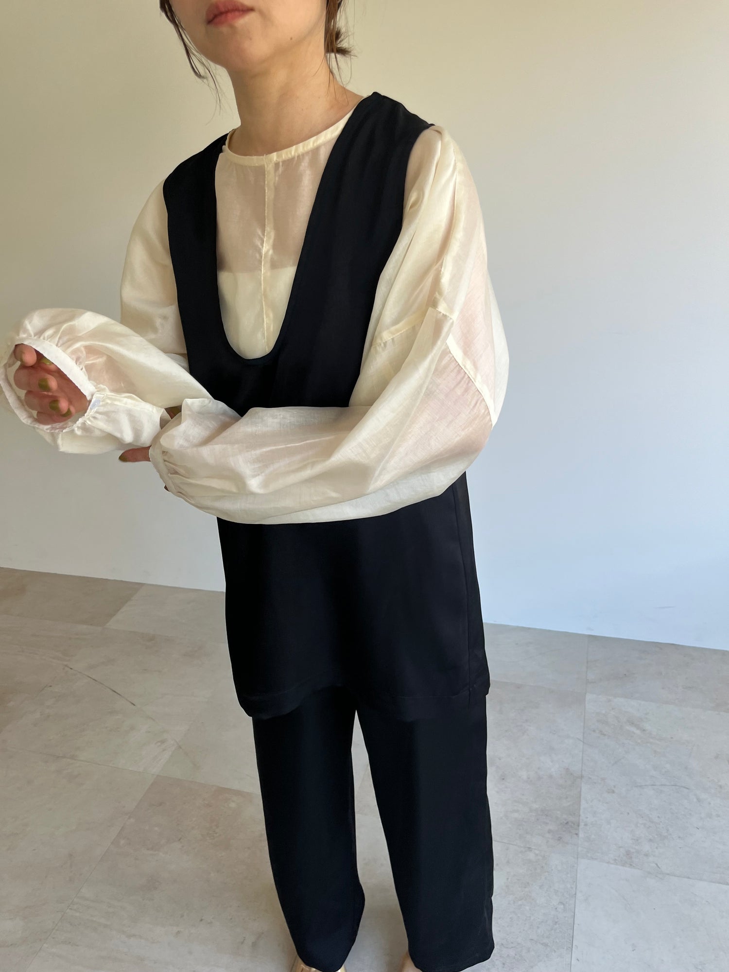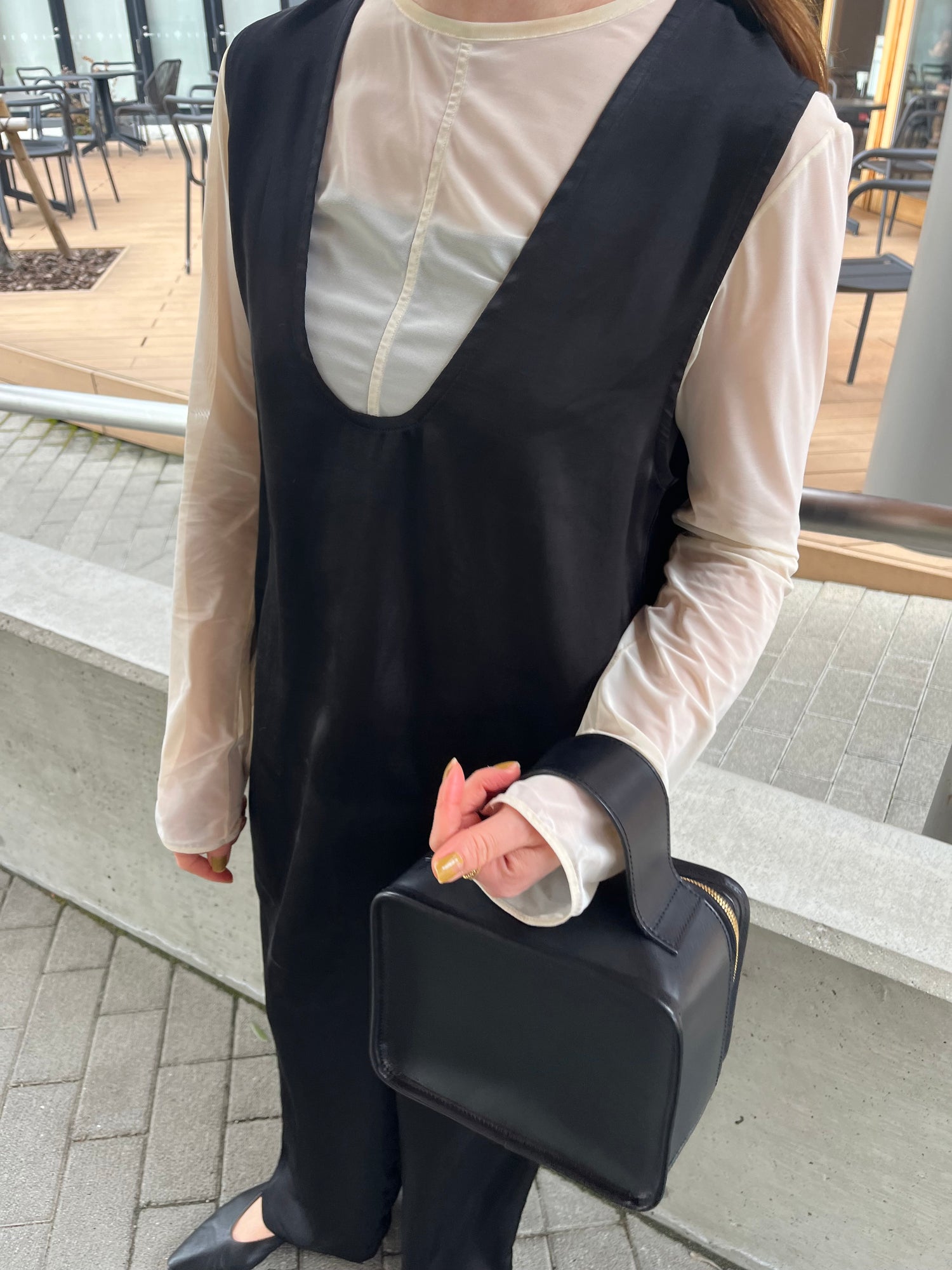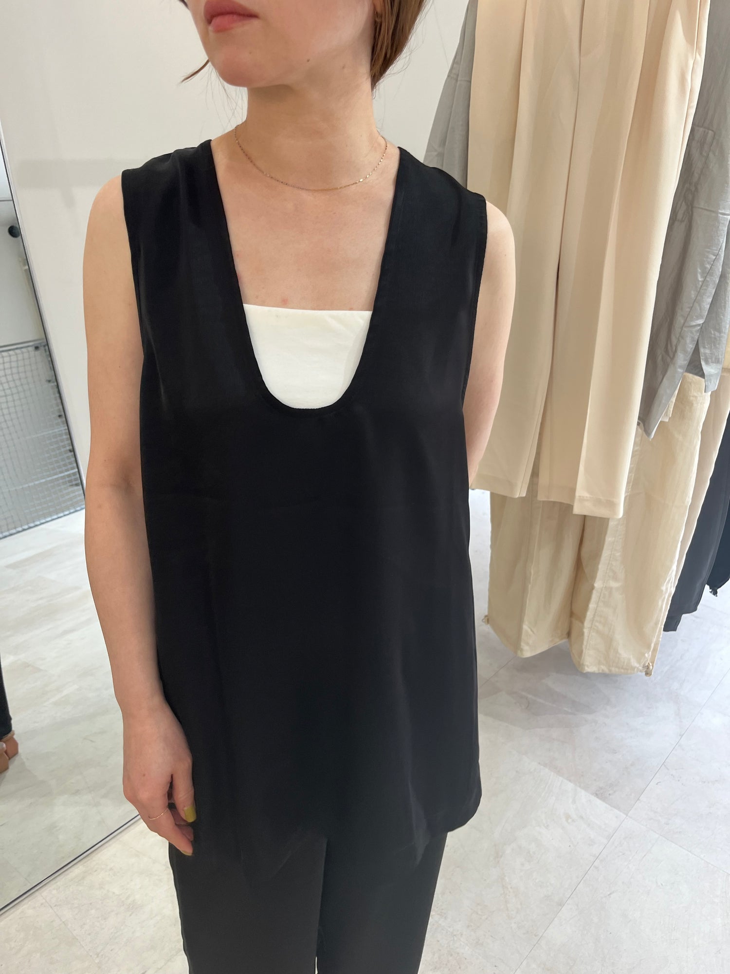 Uネックのシルエットがおしゃれなマットサテンのセットアップ。ウエストゴムのパンツとトップスがセットに。単品使いも着回し出来るので色違いで欲しくなるアイテム。