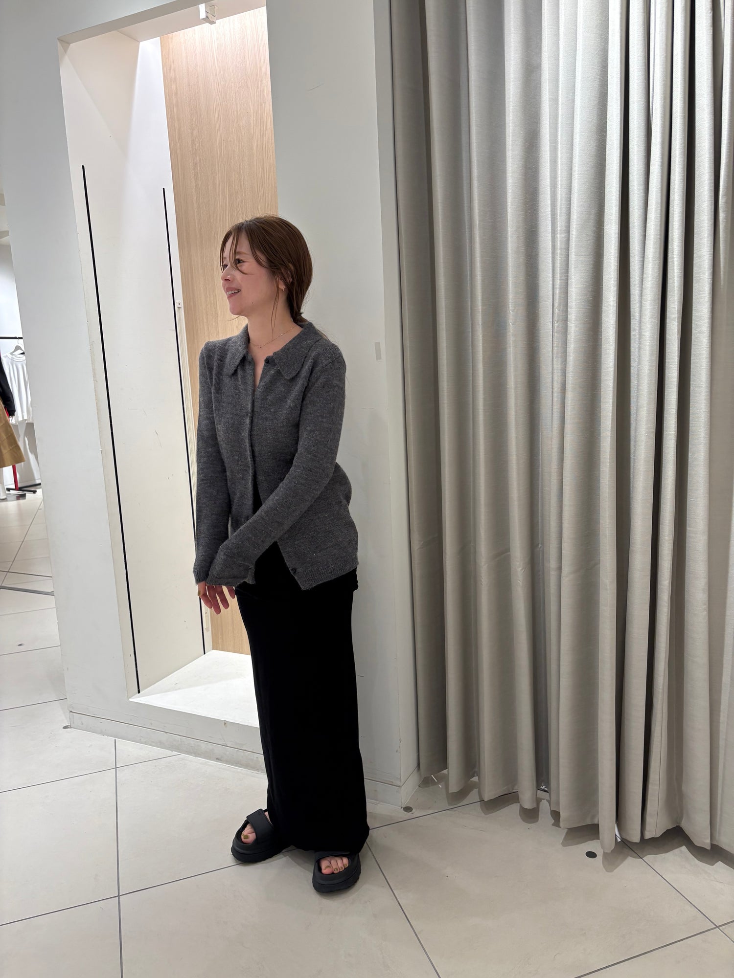 ニットカーディガン。チクチク感が出ない肌触りにこだわりました。柔らかな着心地とシャツ感覚で着れるのでデイリーにも大活躍な1枚。程よいゆとりでボディーラインもひびきにくいのがポイント。ヒップラインが隠れるのでどのボトムにも合わせやすいです。コーデしやすいチャコールのカラーとアイボリーをご用意しました。