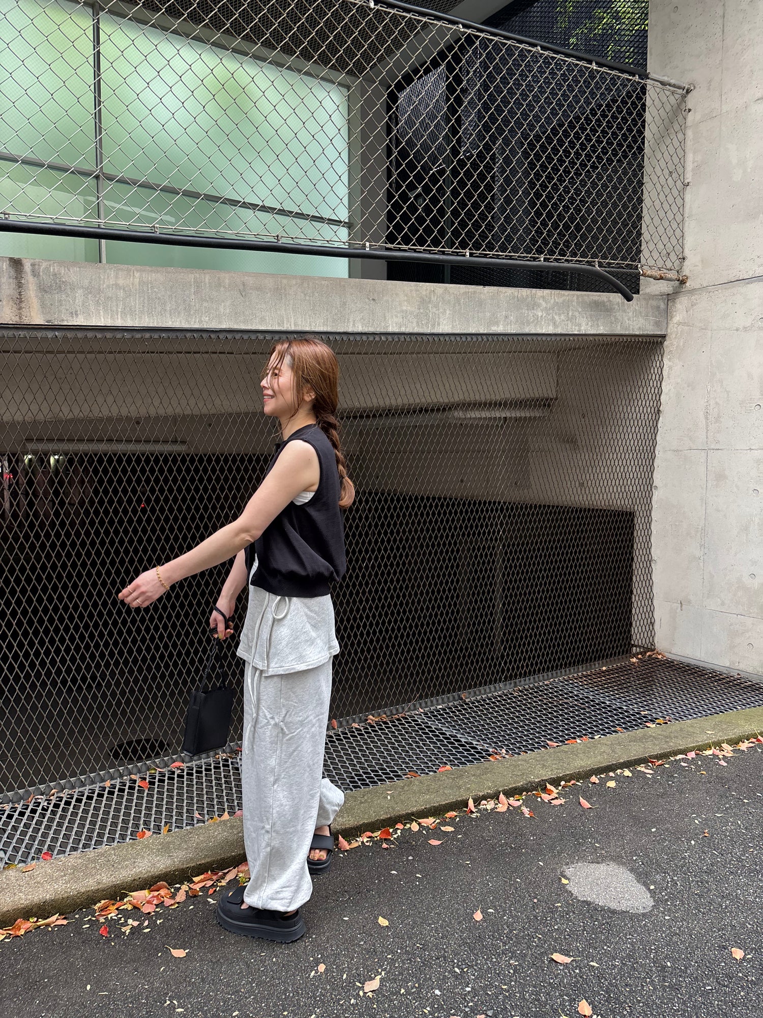 カジュアルになり過ぎないスウェットパンツが完成しました!家着感の出やすいスウェットパンツも女性らしいシルエットに仕上げカットソーと合わせるだけでもこなれ感UPラップスカートを巻く事でウエスト周りも隠せウエストゴムなのでリラクシーな履き心地。