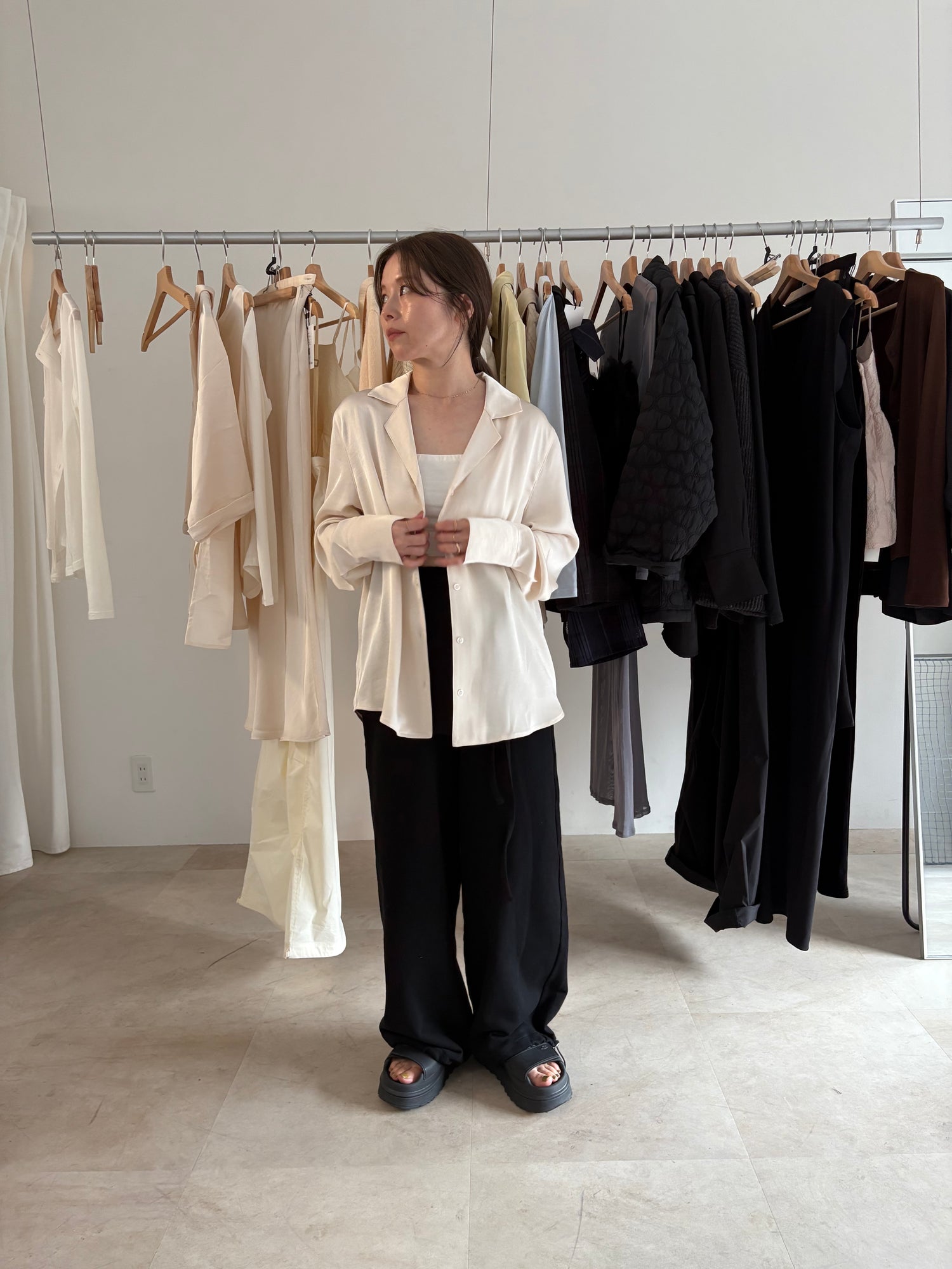 シアートップス合わせで抜け感をプラスしたり、気分に合わせてラップスカートを外したりと色々な着こなしができます。外すとシンプルなパンツに。