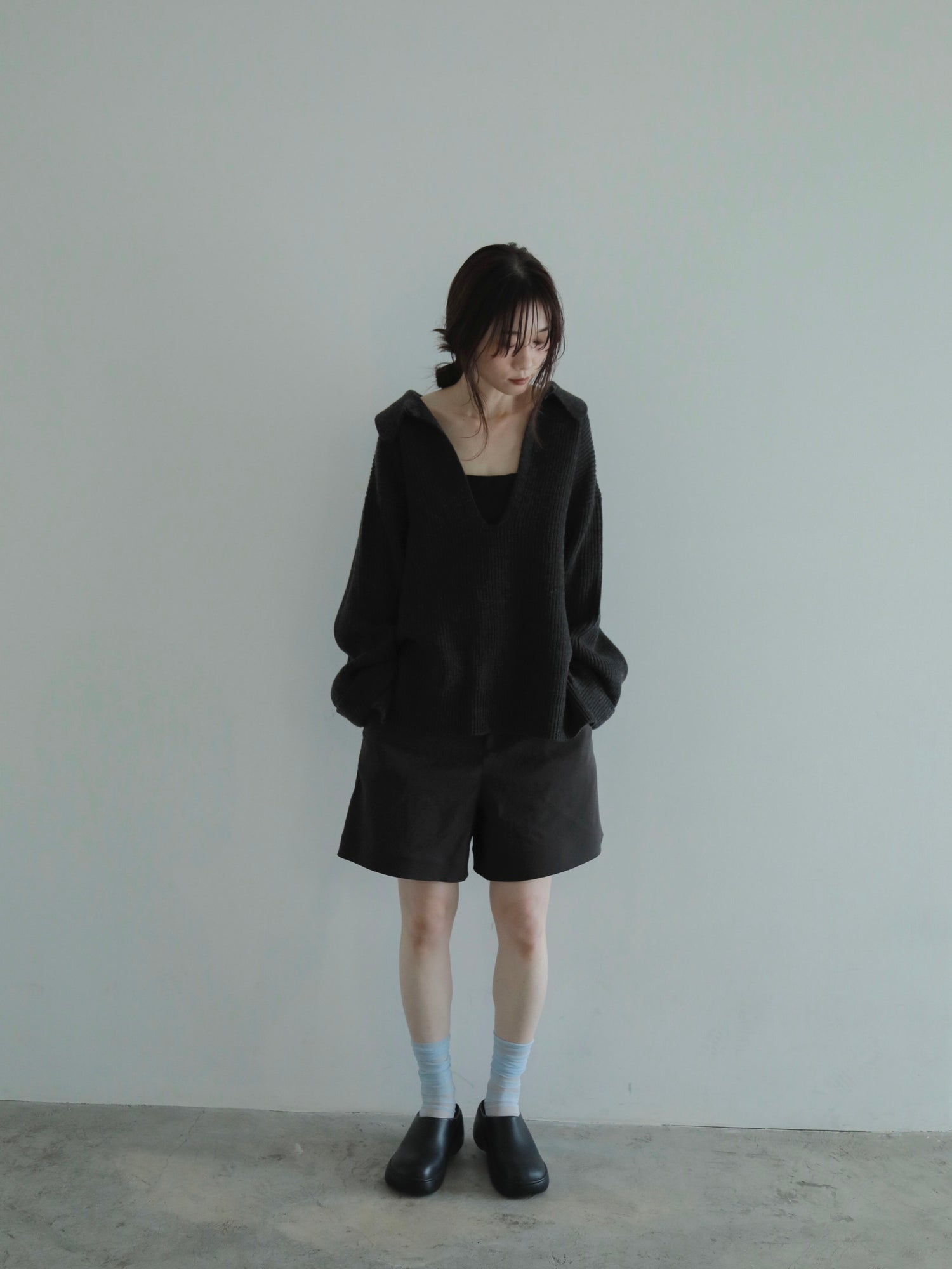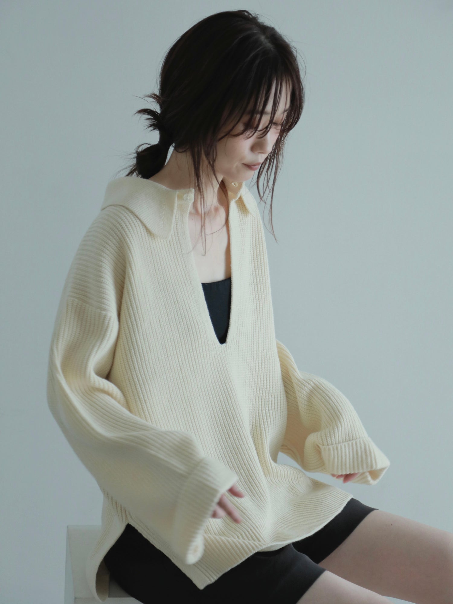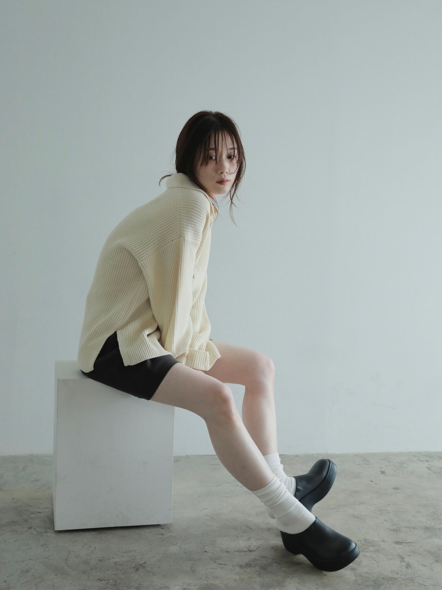 オリジナルカラーで編み上げたスキッパーニット。程よく女性らしさもあるのでカジュアル過ぎない着こなしが叶う1枚。ボタンを閉じて着てもらうとまた違った着こなしが楽しめます。重くなりがちな冬のコーデも開けて着ると抜け感ある着こなしに。