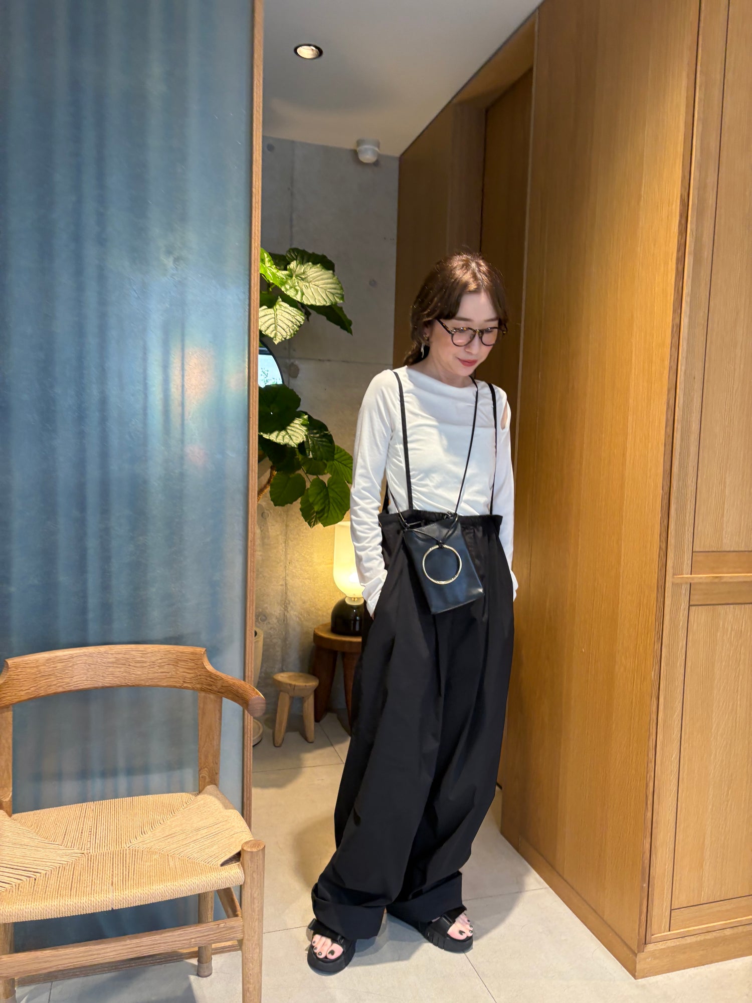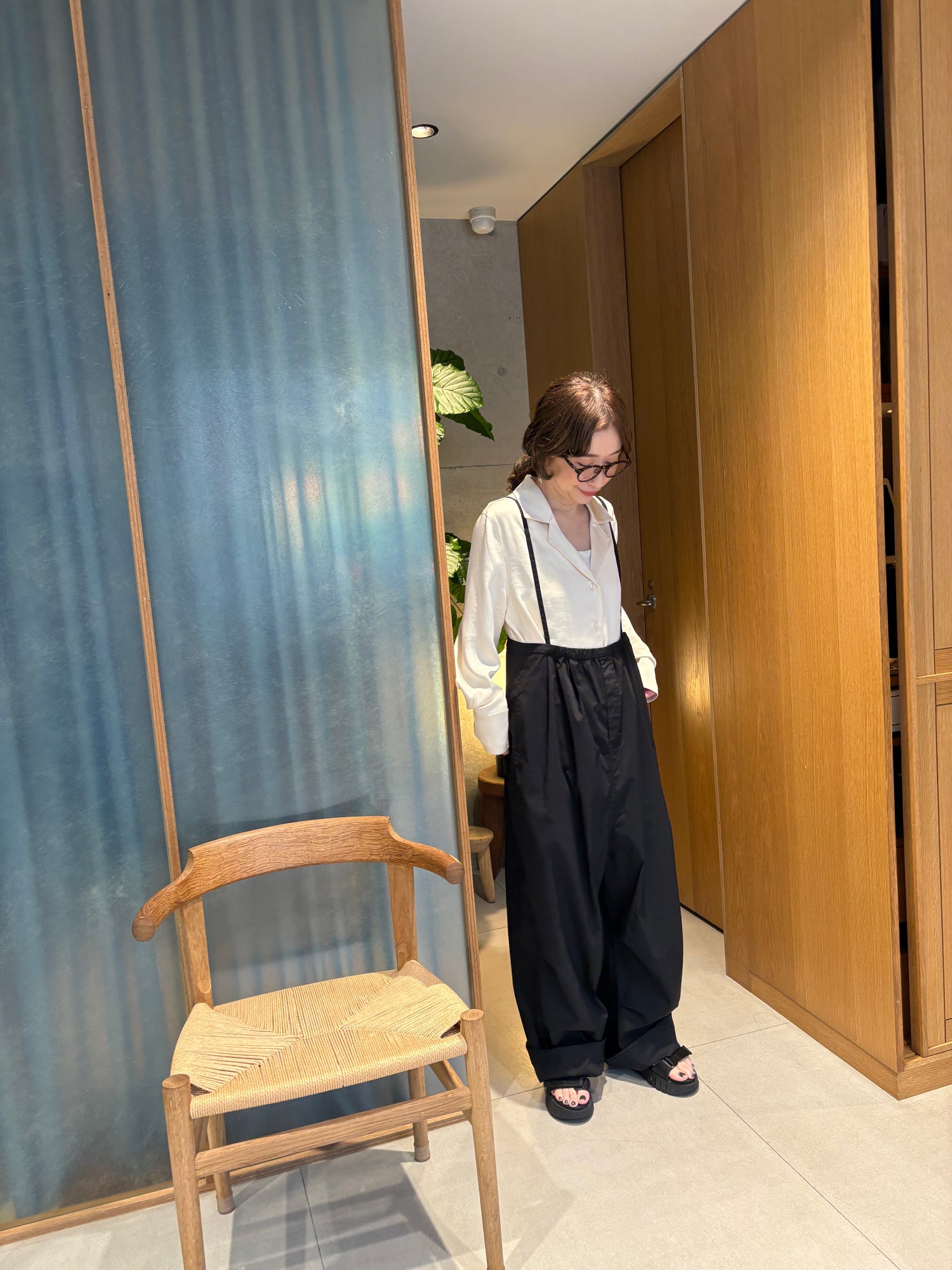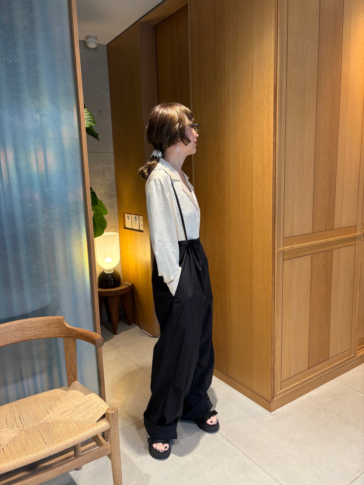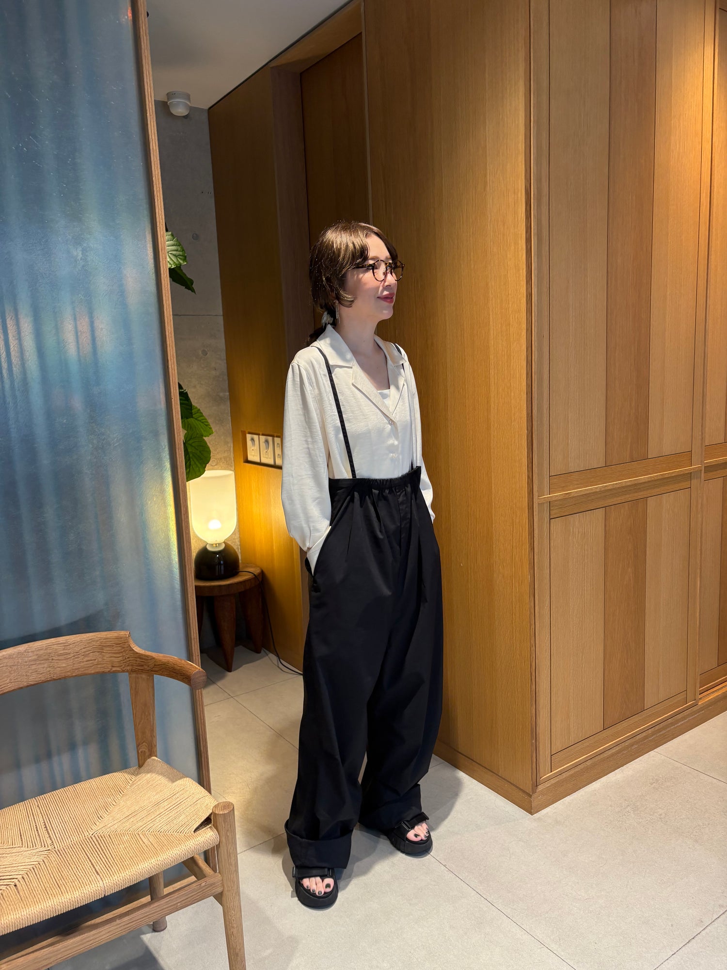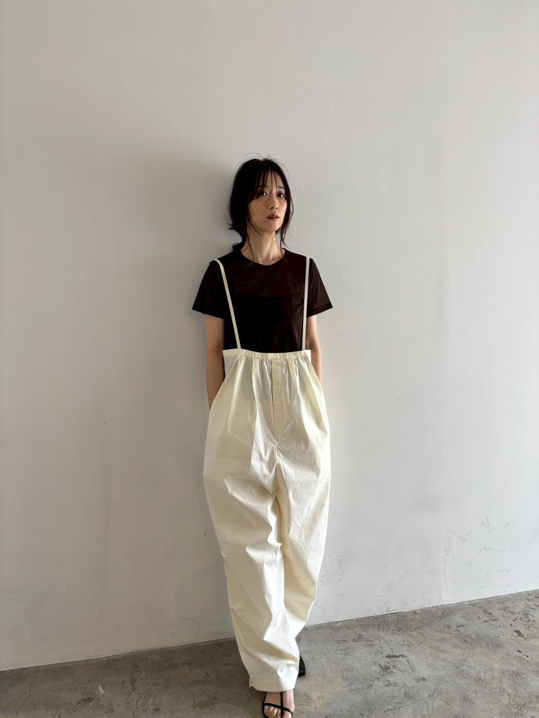 ハリ感のあるコットン素材を使用したサスペンダーパンツ。紐を細めにし、女性らしさを演出。